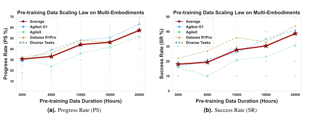 不同于以往依賴仿真數(shù)據(jù)的模型,LingBot-VLA的訓(xùn)練數(shù)據(jù)全部來自真實機器人操作。這讓模型學(xué)到的技能更貼近實際應(yīng)用需求。更關(guān)鍵的是,實驗證明隨著數(shù)據(jù)量從3000小時提升到20000小時,模型下游任務(wù)成功率持續(xù)增長,沒有出現(xiàn)飽和跡象。這意味著更多數(shù)據(jù)還能持續(xù)賦能模型性能。