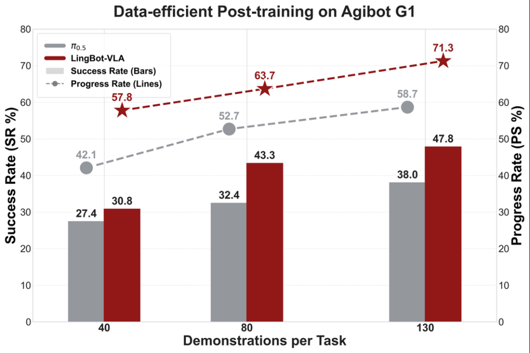 這組數(shù)據(jù)充分證明,LingBot-VLA不僅能在實驗室“跑分”,更能在真實場景中穩(wěn)定輸出。