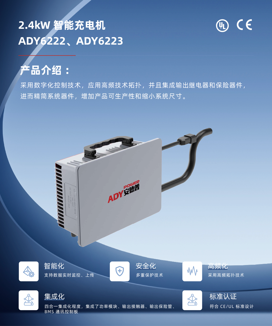 ADY622X采用四合一集成化設(shè)計,將功率模塊、B+MS通訊控制板、輸出繼電器、輸出保險管集成一體,精簡系統(tǒng)器件、縮小產(chǎn)品尺寸;相較傳統(tǒng)充電機(jī)減重56%,整機(jī)僅8.5kg。產(chǎn)品輕量化設(shè)計便于車載使用,適配戶外輾轉(zhuǎn)作業(yè)場景。