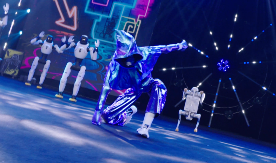 晚會由智元遠征 A2坐鎮(zhèn)主理人,推出了 12 個高水準節(jié)目:開場舞《舞力全開》中,24 臺靈犀X2憑精準群控技術實現(xiàn)動作零偏差,其中一臺機器人更借威亞完成空中姿態(tài)展示,點燃全場氛圍;《武林大會》環(huán)節(jié),數(shù)十臺機器人化身“少林寺弟子”,精準復刻醉拳、火棍等傳統(tǒng)武術招式,剛勁行云的動作盡顯中華武學神韻;全球首個機器人魔術表演《超級變變變!》中,黃曉明跨界擔任 “見證官”,與靈犀X2、遠征A2協(xié)作呈現(xiàn)虛實交織的 “奇跡時刻”,新奇又充滿挑戰(zhàn)。