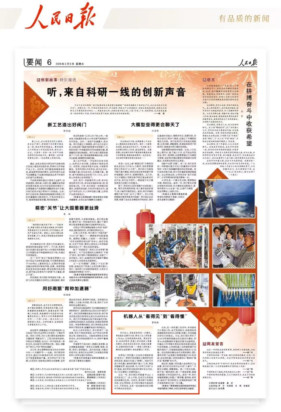 2月6日,《人民日報》要聞版刊登2026新春走基層系列特別報道——《聽,來自科研一線的創(chuàng)新聲音》。繼1月18日登上《人民日報》“十五五”系列報道后,優(yōu)必選視覺算法工程師曾鈺勝再次作為人形機器人行業(yè)的杰出青年代表接受《人民日報》專訪,向記者講述了他在2025年奔赴產(chǎn)業(yè)一線,扎根中國智能制造的故事。