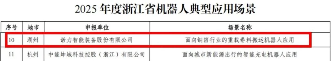 近日,浙江省經(jīng)濟和信息化廳正式發(fā)布了《關(guān)于公布2025年機器人典型應(yīng)用場景和“機器人+”應(yīng)用標(biāo)桿企業(yè)的通知》,諾力智能裝備股份有限公司憑借“面向銅箔行業(yè)的重載卷料搬運機器人應(yīng)用”項目,成功入選2025年度浙江省機器人典型應(yīng)用場景!