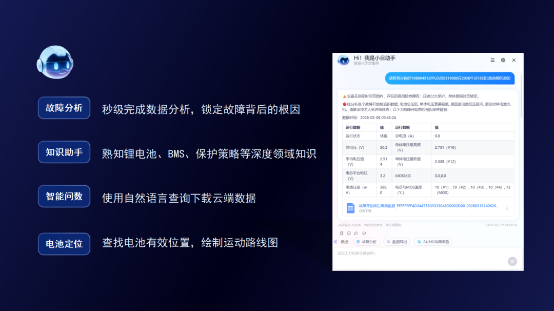 優(yōu)旦科技將多年積累的鋰電知識庫、保護策略和故障模型融入小旦助手的“AI大腦”,實現(xiàn)秒級故障根因分析。當用戶提問一個設備故障時,系統(tǒng)自動定位故障時刻、調取運行數(shù)據(jù),并從海量信息中精準鎖定根本原因,讓每個運維人員都擁有“老師傅”級別的分析能力。