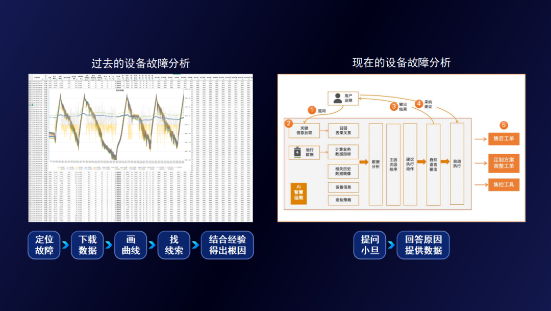 發(fā)布會現(xiàn)場,團隊設置了一場“人機對決”:面對三臺突發(fā)“壓差過大保護”故障的換電設備,傳統(tǒng)模式下,工程師需手動導出數(shù)千條數(shù)據(jù),逐幀繪制曲線才能定位原因。而小旦助手接入系統(tǒng)的瞬間,不到1分鐘即完成了故障時刻定位、數(shù)據(jù)調取與根因鎖定。