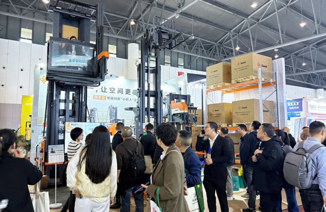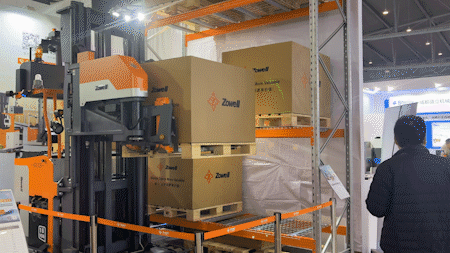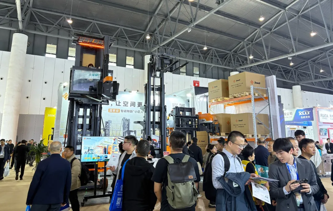 動態(tài)演示區(qū),窄巷道三向AGV叉車在模擬場景中自主行駛、堆垛,展現(xiàn)了無人化作業(yè)能力,現(xiàn)場客商紛紛駐足拍照。