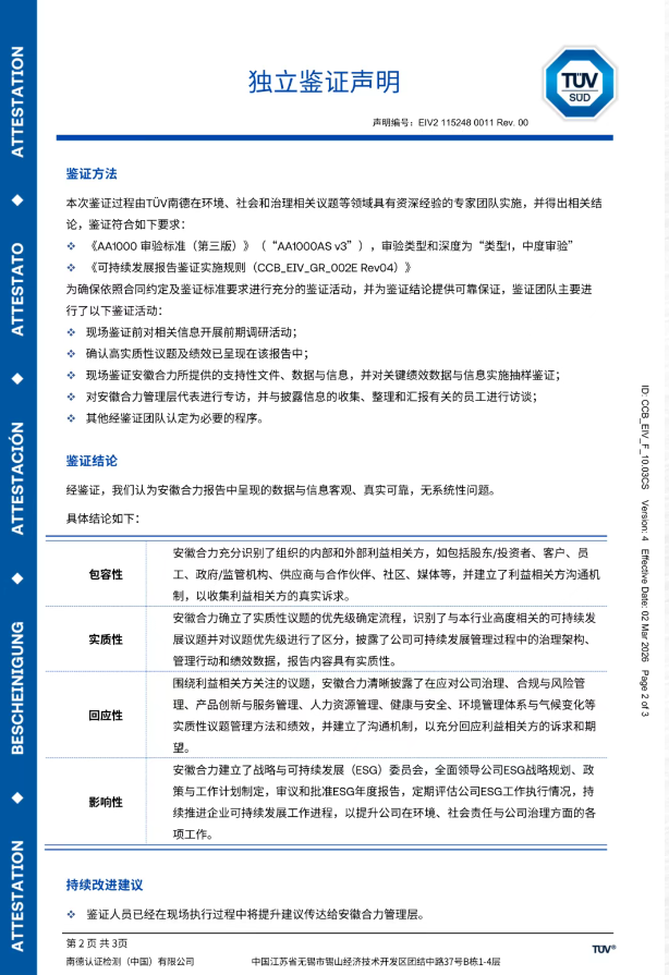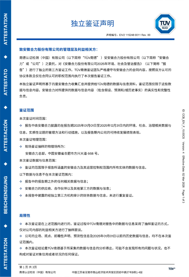 近日,合力發(fā)布《2025年度環(huán)境、社會及管治(ESG)報告》。這是合力連續(xù)發(fā)布的第18份可持續(xù)發(fā)展/社會責任報告,也是首份由國際權(quán)威的第三方檢測認證機構(gòu)TüV南德提供獨立鑒證聲明的ESG報告。報告以合力“BOOST”可持續(xù)發(fā)展戰(zhàn)略為核心引領(lǐng),全面系統(tǒng)展現(xiàn)了公司在環(huán)境、社會及管治(ESG)領(lǐng)域的年度實踐與績效成果。