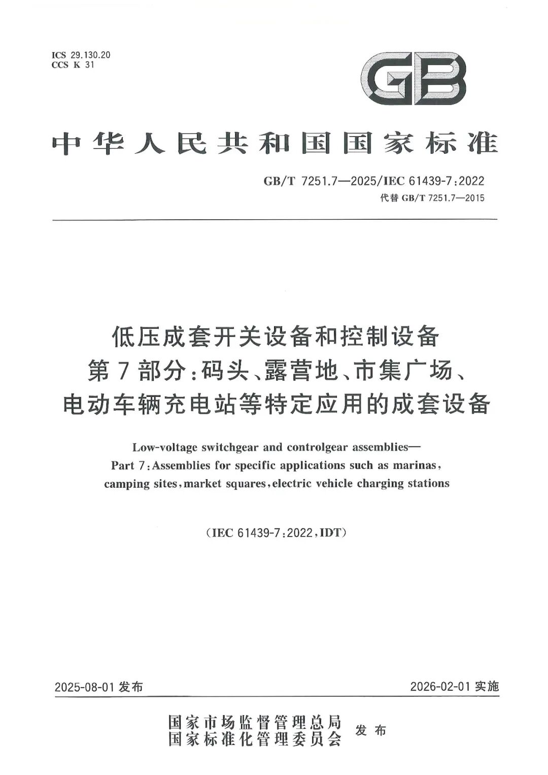 本次安德普作為主要起草單位參與制定的國家標準為 GB/T 7251.7-2025/IEC 61439-7:2022《低壓成套開關(guān)設(shè)備和控制設(shè)備 第7部分:碼頭、露營地、市集廣場、電動車輛充電站等特定應用的成套設(shè)備》。該標準于2025年8月1日發(fā)布,2026年2月1日實施,為包括電動車輛充電站在內(nèi)的特定應用場景的低壓成套設(shè)備,提供了全面的安全、結(jié)構(gòu)與性能要求。
