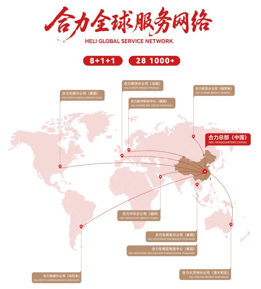 合力叉車主導(dǎo)產(chǎn)品是“合力、HELI”牌系列叉車,在線生產(chǎn)的1700多種型號(hào)、512類產(chǎn)品全部具有自主知識(shí)產(chǎn)權(quán),產(chǎn)品的綜合性能處于國(guó)內(nèi)領(lǐng)先、國(guó)際先進(jìn)水平,公司在國(guó)內(nèi)擁有自主的營(yíng)銷網(wǎng)絡(luò),在國(guó)內(nèi)建立了23個(gè)省級(jí)營(yíng)銷網(wǎng)絡(luò)和320多家二級(jí)代理銷售服務(wù)網(wǎng)點(diǎn),是國(guó)內(nèi)叉車行業(yè)最完善,最健全的服務(wù)體系。在海外72個(gè)國(guó)家或地區(qū)建立了海外代理網(wǎng)絡(luò),產(chǎn)品銷往世界130個(gè)國(guó)家和地區(qū),其中歐美發(fā)達(dá)國(guó)家或地區(qū)占公司出口量的60%。