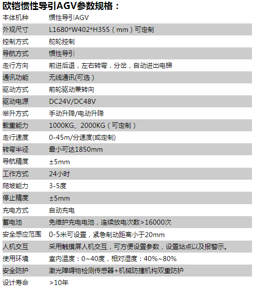 歐鎧無軌慣性導(dǎo)引AGV采用磁釘導(dǎo)引技術(shù)通過對陀螺儀偏差信號的計算及地面定位塊信號的采集來確定自身的位置和方向,可以自動進(jìn)出電梯,具有高精度,高效率執(zhí)行搬運工作。
