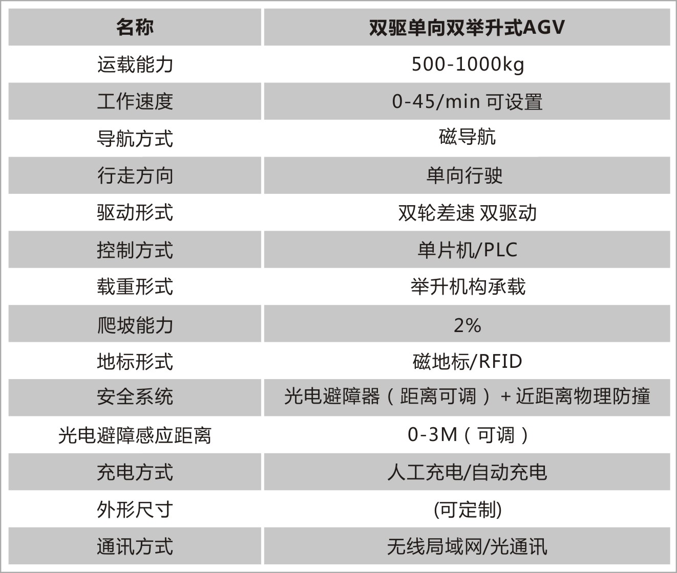雙驅單向雙舉升式AGV,通過背部兩個舉升臺升降裝卸及運輸物料,亦可通過人工控制AGV運行及機構升降。