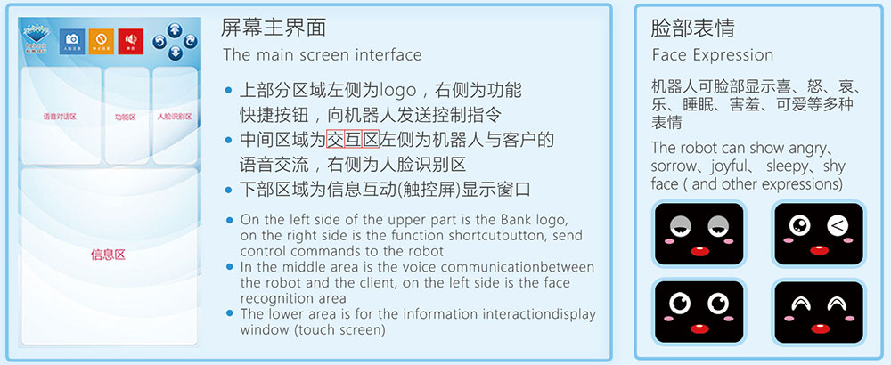 銀行機器人的功能有:自定義臉部表情、屏幕調節(jié)升降、人臉辨識
