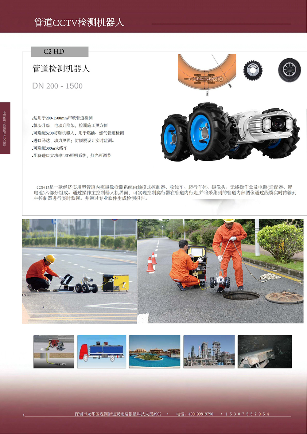 該管道機(jī)器人屬于經(jīng)濟(jì)實(shí)用型管道內(nèi)窺攝像檢測(cè)系統(tǒng),總研發(fā)出型號(hào)有:C1、C2、C3、C5這4款,由觸摸式控制器、手動(dòng)收線車、爬行車體、攝像頭、無線操作盒及電源(適配器、鋰電池)等部分組成。通過操作主控制器人機(jī)界面,可實(shí)現(xiàn)控制爬行器在管道內(nèi)行走,并將采集到的管道內(nèi)部圖像通過線纜實(shí)時(shí)傳輸?shù)街骺刂破鬟M(jìn)行實(shí)時(shí)監(jiān)視。
