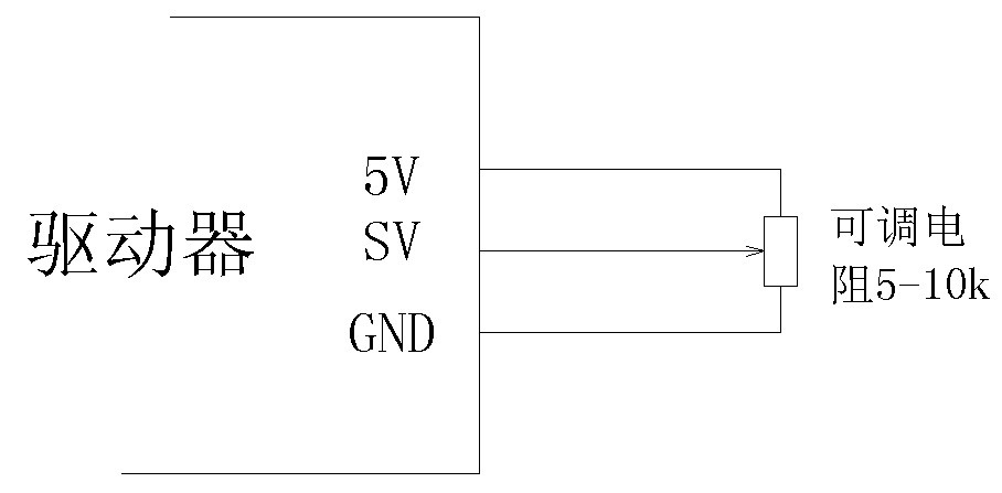 圖中可調(diào)電阻的阻值應(yīng)在 5K-10K 之前,在接分壓電阻時(shí)應(yīng)先確認(rèn)好電阻的兩 端及中間抽頭再連接,錯(cuò)誤的接法有可能使 5V 電源短路導(dǎo)致驅(qū)動(dòng)器損壞。若連接后, 或在調(diào)節(jié)分壓電阻時(shí),驅(qū)動(dòng)器電源 LED 指示燈變暗或者滅掉,應(yīng)立即斷開驅(qū)動(dòng)器電源, 重新認(rèn)確電阻引腳后再接。