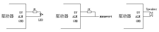 ALM 信號(hào)輸出是三極管開漏輸出。當(dāng)驅(qū)動(dòng)器 發(fā)生,短路,過流,霍爾信號(hào)錯(cuò)誤, 過電壓,欠壓等異常時(shí),在 ALM 輸出低電平。其吸收電流應(yīng)小于 50mA ,報(bào)警輸 出電路有如下幾種