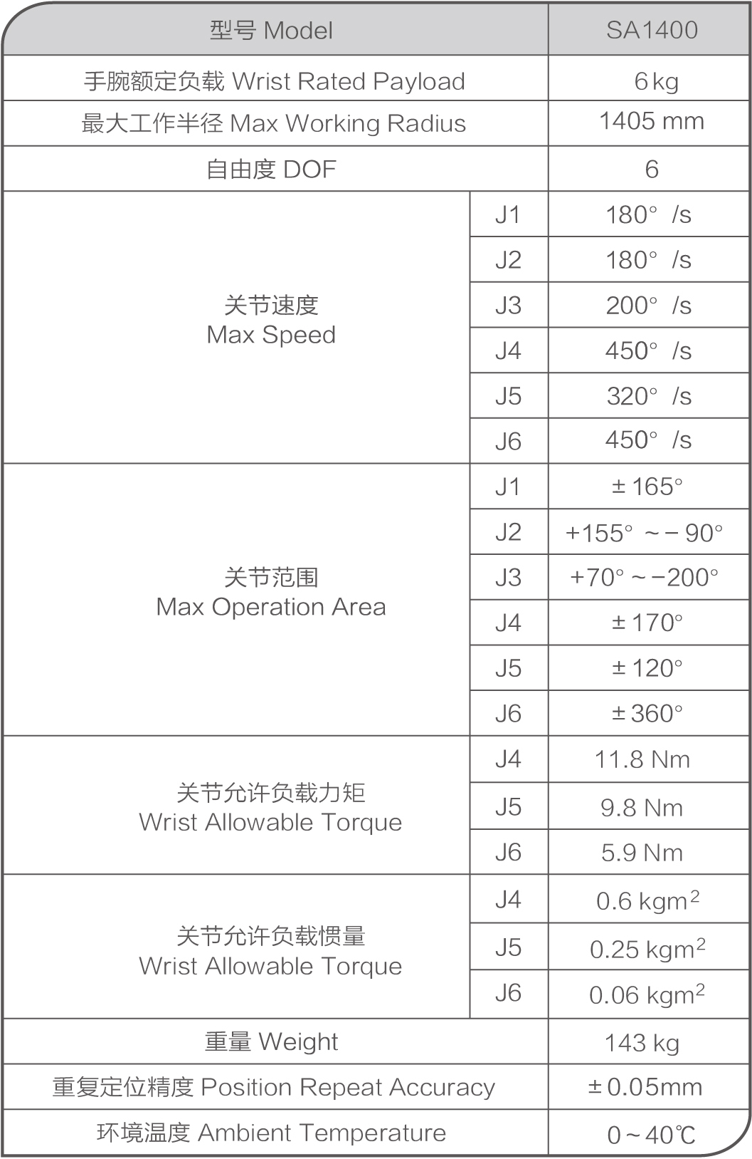 SA1400特性:手腕負(fù)載為6Kg,最大半徑為1405mm。