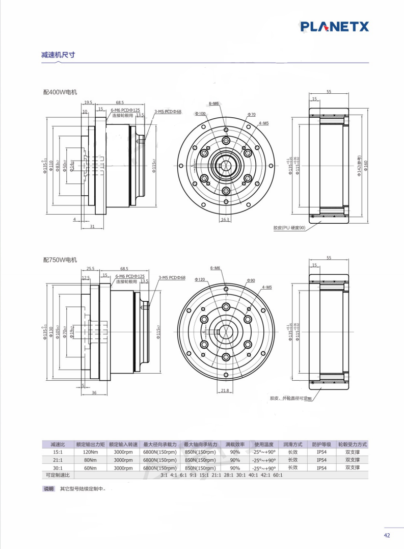 AGV專用減速輪,100%自主研發(fā)?。?!AGV減速機(jī)智能倉儲(chǔ)機(jī)器人專用減速機(jī) 無人搬運(yùn)小車可匹配不同品牌、不同類型的電機(jī),可根據(jù)客戶要求配套減速機(jī)跟電機(jī)出售; 車輪與減速機(jī)采用一體化體積小,節(jié)省空間,安裝簡單; 采用行星減速機(jī)結(jié)構(gòu);扭矩大;平順性好;使用壽命更長; 廣泛應(yīng)用在物流倉儲(chǔ)機(jī)器人、及AGV小車上,是全新設(shè)計(jì)的輪式減速機(jī),代替?zhèn)鹘y(tǒng)的車輪+減速機(jī)+電機(jī)+大量螺絲模式,減少傳動(dòng)鏈,提高傳動(dòng)控制精度,降低維護(hù)難度。