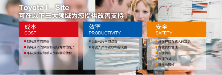 Toyota I_Site能幫助車隊(duì)或物流經(jīng)理全方位了解車隊(duì)的運(yùn)營(yíng)情況、物料幫運(yùn)的整體運(yùn)作效率和駕駛?cè)藛T的作業(yè)表現(xiàn),同時(shí)強(qiáng)大的Toyota I_Site專家團(tuán)隊(duì),將密切關(guān)注您的車隊(duì)信息,為您定制車隊(duì)優(yōu)化的解決方案,在持續(xù)改善中為您呈現(xiàn)車隊(duì)管理的無(wú)限可能。
