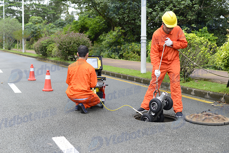 工程勘測(cè)人員將CCTV管道檢測(cè)機(jī)器人放入管道內(nèi)檢測(cè)并通過攝像頭實(shí)時(shí)接收傳回的圖像視頻
