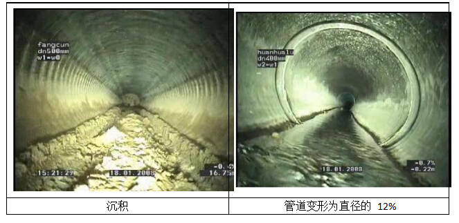 采用CCTV管道機器人視頻檢測,對排水系統(tǒng)的管道內(nèi)部狀況進行檢測,查明排水管道內(nèi)部的結(jié)構(gòu)性缺陷(如管道破裂、洞、塌陷、變形、接頭錯位或者脫節(jié)等)和功能性缺陷(如淤積、結(jié)垢、異物、垃圾、樹根等),為管道后期修復提供全面、準確和可靠的依據(jù)。