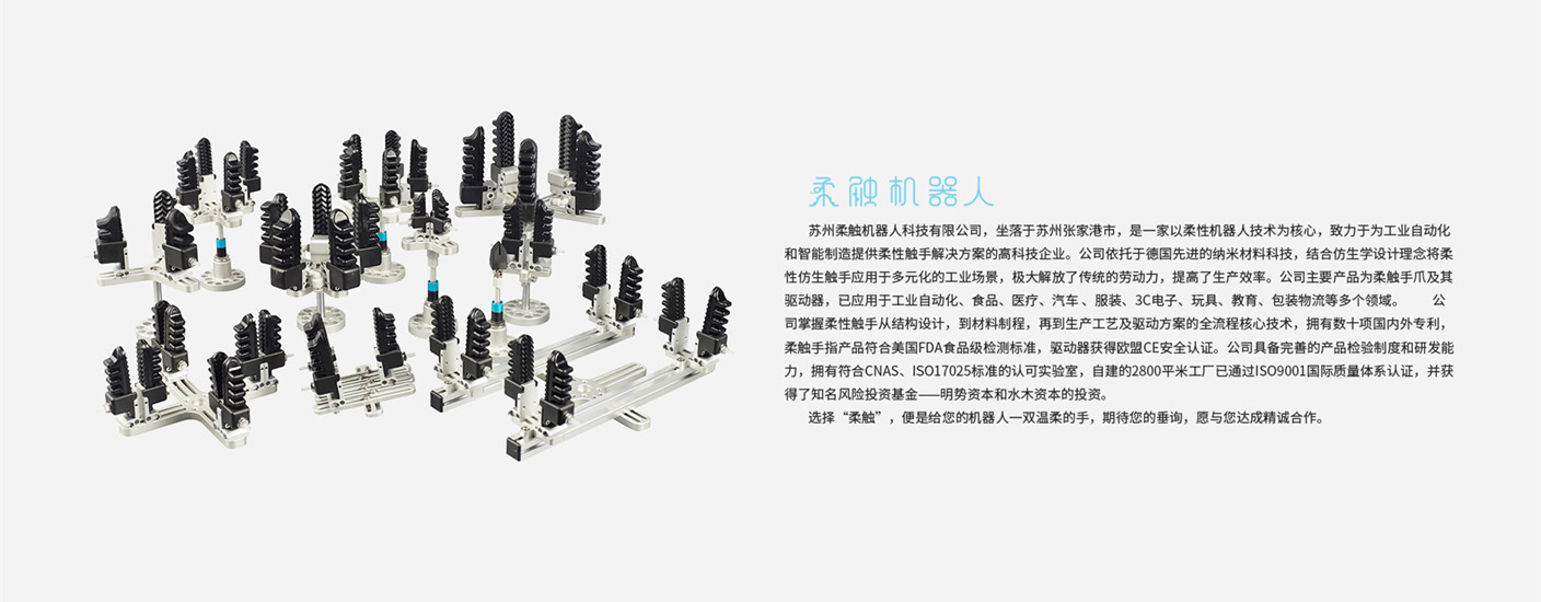 蘇州柔觸機(jī)器人科技有限公司,坐落于蘇州張家港市,是一家以柔性機(jī)器人技術(shù)為核心,致力于為工業(yè)自動(dòng)化和智能制造提供柔性觸手解決方案的高科技企業(yè)。公司依托于德國先進(jìn)的納米材料科技。結(jié)合仿生學(xué)設(shè)計(jì)理念將柔性仿生觸手應(yīng)用于多元化的工業(yè)場景,極大解放了傳統(tǒng)的勞動(dòng)力,提高了生產(chǎn)效率。公司主要產(chǎn)品為柔觸手爪及其控制器,已應(yīng)用于工業(yè)自動(dòng)化、食品、醫(yī)療、汽車、服裝、3C電子、玩具、教育、包裝物流等多個(gè)領(lǐng)域。