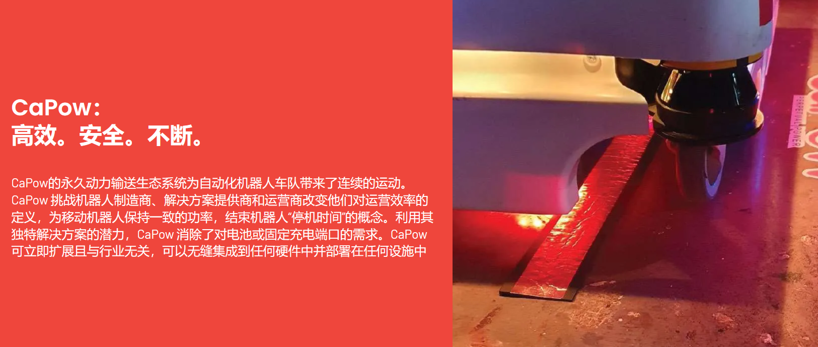我們的解決方案超越了現(xiàn)有的解決方案,重新構(gòu)想了電力傳輸?shù)目赡苄?。亨利·福特有句名言:“如果我問人們他們想要什么,他們?huì)說更快的馬。我們認(rèn)識(shí)到,永久動(dòng)力需要超越“更好的電池”。CaPow正在推動(dòng)自動(dòng)化機(jī)器人車隊(duì)的未來。